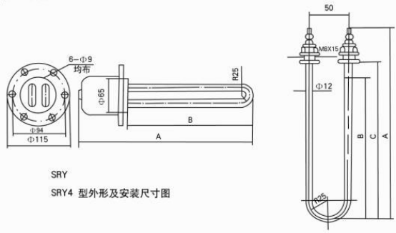 SRY2、SRY3型管状润滑油电加热器用于敞开或封闭式油槽中加热油用。SRY4型管状润滑油电加热器用于加热流动或循环的油。